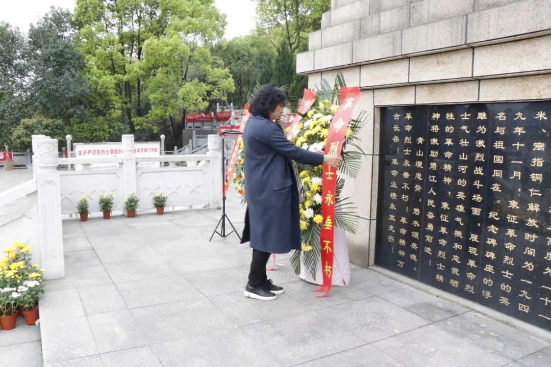 青山埋忠骨,史册载功勋。在纪念碑前,学院党委书记黄霞动情地说:“这里长眠着的是为了民族独立和国家尊严而抛头颅、洒热血的革命先烈们。面对战场,他们毫不退缩,敢于牺牲。面对小家,他们毫无私心,义不容辞选择奉献。回顾党的光辉历程,学习党的百年历史,我们能真切感受革命先烈绝对忠诚、信念坚定、勇于牺牲、肝胆为民的崇高精神,他们用这种精神生动诠释着初心与担当,他们用共产党人的政治品格和优良作风感召着我们,指引着我们,滋养着我们。大家要认认真真、扎扎实实学习党史,在学思践悟中,汲取前行力量,传承红色精神,在学院里、在课堂上把革命先辈们的故事世世代代宣扬下去,传颂下去。”