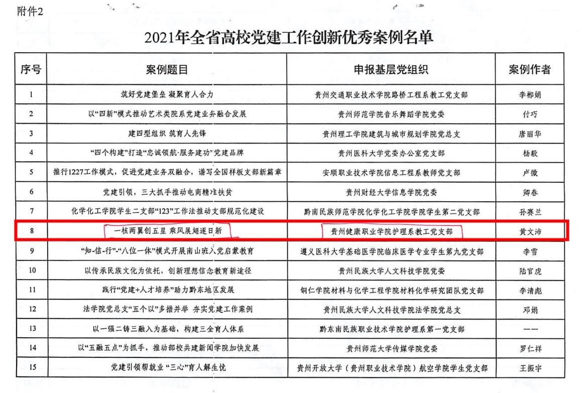 近日,中共贵州省委教育工委印发了《省委教育工委关于公布2021年全省高校党建工作创新最佳案例和优秀案例名单的通知》,公布了“2021年全省高校党建工作创新最佳案例”和“2021年全省高校党建工作创新优秀案例”名单,我院推送的人文基础部党支部案例“党建领航,深耕‘琢玉·人文’责任田”荣获“全省高校党建工作创新最佳案例”,护理系教工党支部案例“一核两翼创五星 乘风展翅逐日新”荣获“全省高校党建工作创新优秀案例”。