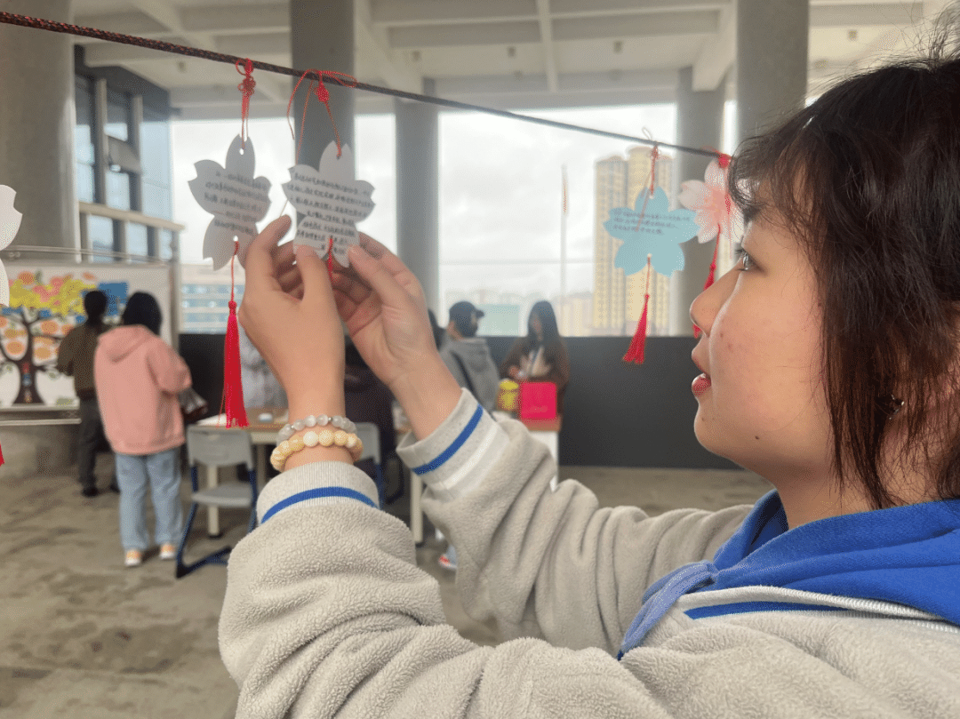 在“我喜欢的一本书”展板前,师生们贴上了心愿条,推荐自己喜爱的图书。“愿每天读书思考的你多一份快乐,少一份忧愁”,“祝福语盲盒”活动台前,师生们随机抽取祝福语并大声朗读出来。