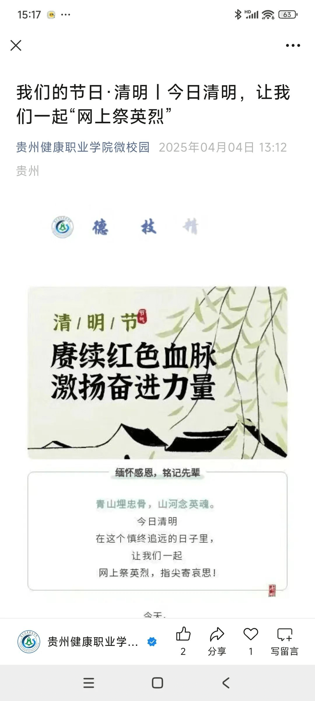 网上祭英烈,指尖寄哀思。在清明节当天,学校微信公众号发布了网上祭扫活动,党委学工部发出倡议,组织学生通过中华英烈网、贵州英烈网等平台开展网上祭扫和留言寄语,怀着最诚挚的敬意,跨越时空,铭记历史,缅怀先烈,致敬英雄。