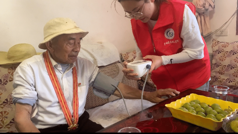 志愿者为“七一勋章”“全国劳动模范”“时代楷模”“全国道德模范”称号获得者黄大发测量血压
