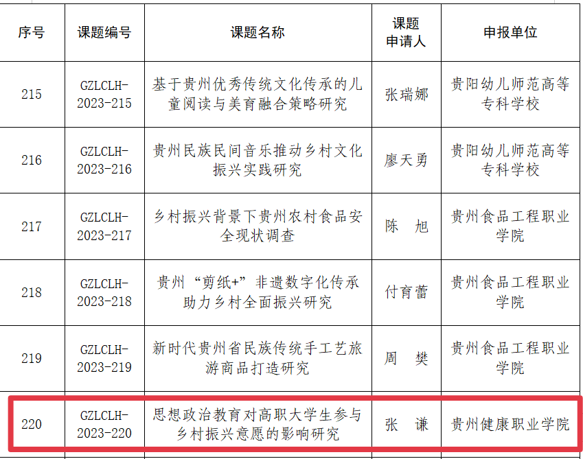 近日,《省社科联关于2023年度贵州省理论创新课题(联合课题)立项的通知》发布,我院马克思主义教学部张谦老师课题组申报的《思想政治教育对高职大学生参与乡村振兴意愿的影响研究》课题成功立项。