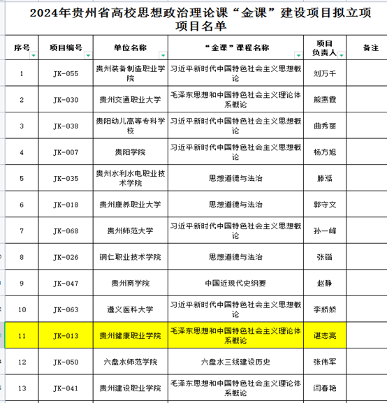 教师谌志亮牵头申报的《毛泽东思想和中国特色社会主义理论体系概论》课程被立项为贵州省思想政治理论课“金课”建设项目。标志着该课程在教学质量、教学内容、教学方法等方面达到了省级领先水平,为我院思政课建设进一步发展和创新提供了有力支撑。