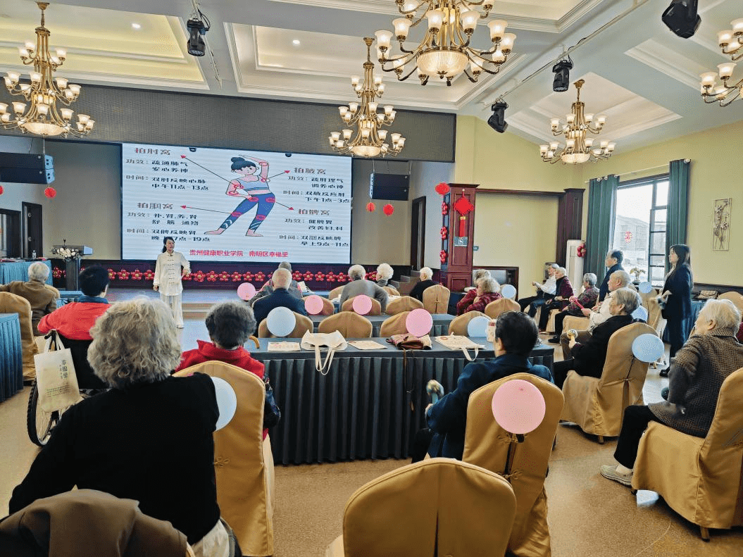 中医学专业带头人、《老年人生活能力康复训练》课程负责人简燕进老师发挥专业特长指导老人们开展了八段锦和拍八虚活动,指导老人们每天坚持锻炼,保持健康的心态和体魄。