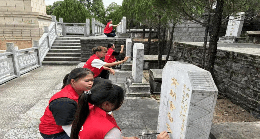 实践队来到文笔峰烈士陵园为烈士扫墓。这不仅是对英烈的缅怀,更是一堂生动的爱国主义教育课。园内部分墓碑的金漆已出现脱落,同学们手持细毛笔,细细描摹每一笔金漆。在专注填补字迹的过程中,大家对红色精神有了更真切的体悟。