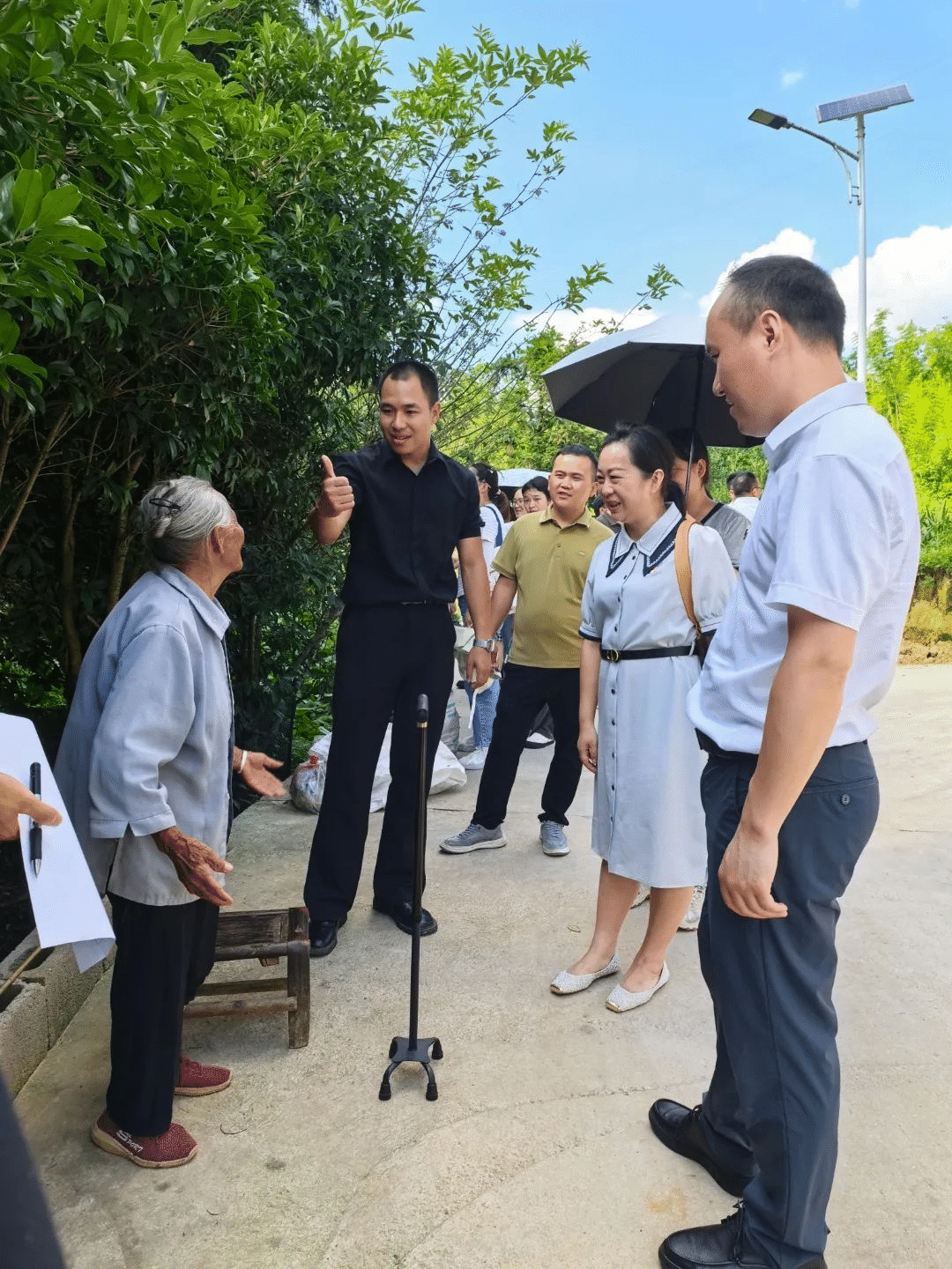 上门服务暖民心。教师党员们分组行动,携带轮椅、电子血压仪、助行器等专业器材,深入十几位村民家中,特别是高龄、行动不便的老人家庭,提供精准帮扶。康复治疗专业的老师们“手把手”指导老人正确使用辅助器具,耐心讲解注意事项;养老照护团队来到半失能老人汪绪明家赠送轮椅,为其家人耐心讲解了防褥疮、患肢康复等照护知识。