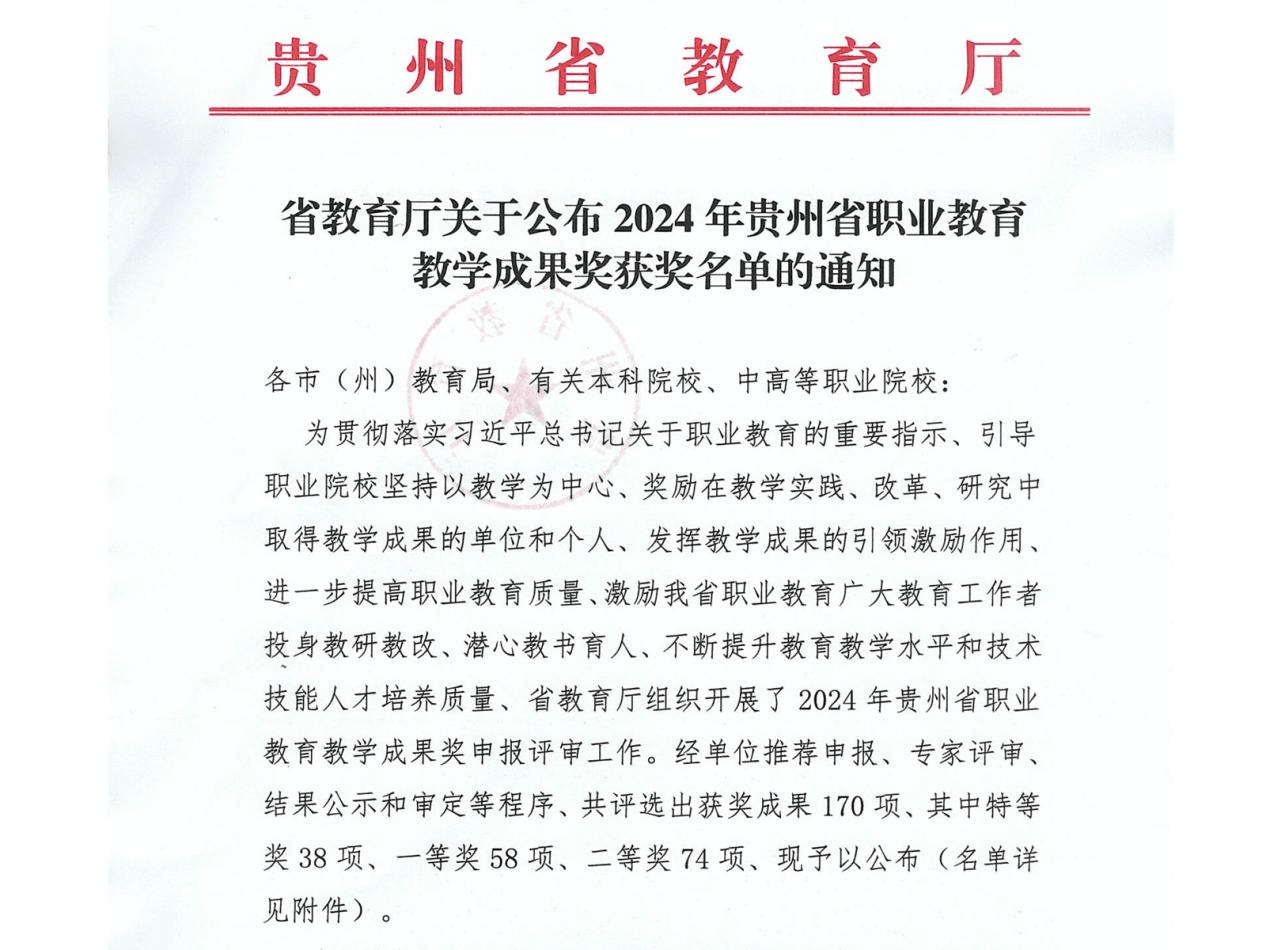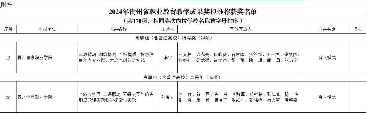 近日,贵州省教育厅公布了2024年贵州省职业教育教学成果奖获奖项目名单,pg娱乐申报的《三思铸魂 四维协同 五核提质:智慧健康养老专业群人才培养创新与实践》荣获特等奖、《“四方协同 三课联动 五维交互”的高职思政课实践教学探索与实践》荣获二等奖。