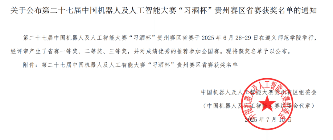 近日,第二十七届中国机器人及人工智能大赛“习酒杯”贵州赛区选拔赛在遵义师范学院顺利落幕。pg娱乐派出的参赛队伍食光AI创翼队、协同智行队凭借扎实的专业素养崭露头角。其中由李乾、王磊老师指导的食光AI创翼队荣获省级二等奖,并成功晋级全国总决赛,协同智行队荣获省级三等奖。