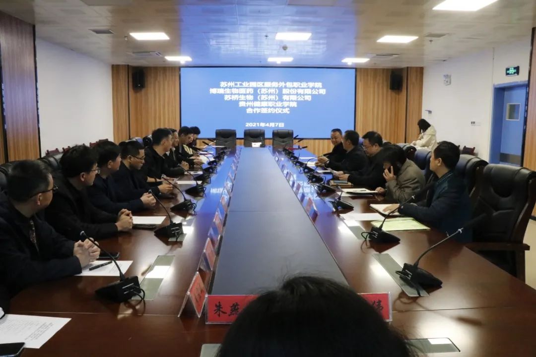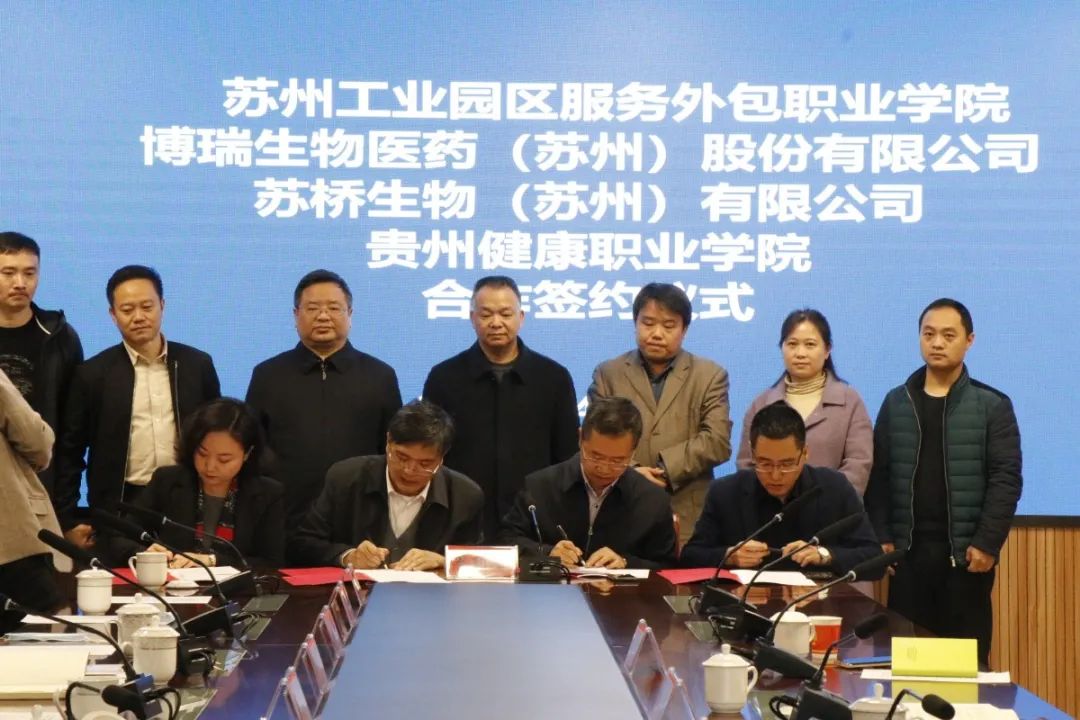 4月7日,我院与苏州工业园区服务外包职业学院、博瑞生物医药(苏州)股份有限公司、苏桥生物(苏州)有限公司举行合作签约仪式。苏州工业园区服务外包职业学院党委书记、校长严世清,院党委副书记、院长吴国才出席。