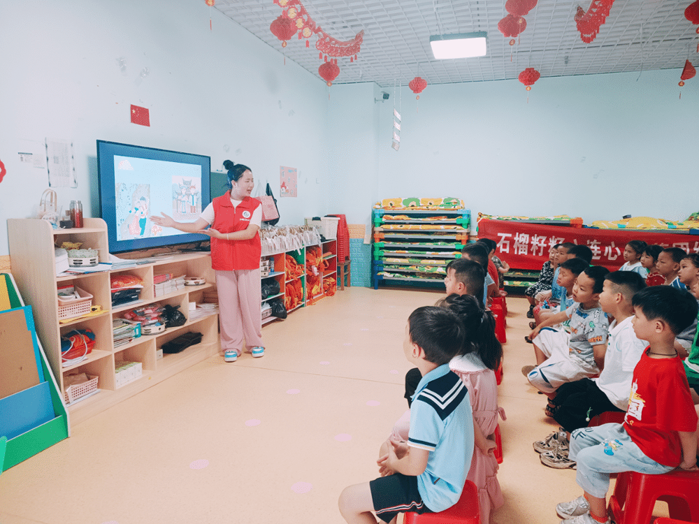 志愿者在幼儿园讲解民族知识
