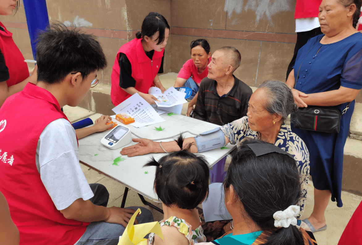 “爷爷,你这个血压高哦,要坚持测血压、注意降温避暑、适量运动和根据血压调整药量。”健康管理专业罗江磊同学细心为社区居民测量血压时叮嘱道。“马上放暑假了,一定要叮嘱屋里娃儿不要下河洗澡哦。”在给居民宣传健康常识、消防安全、防溺水等知识时,志愿者们跟现场的居民你一言我一句的聊了起来。
