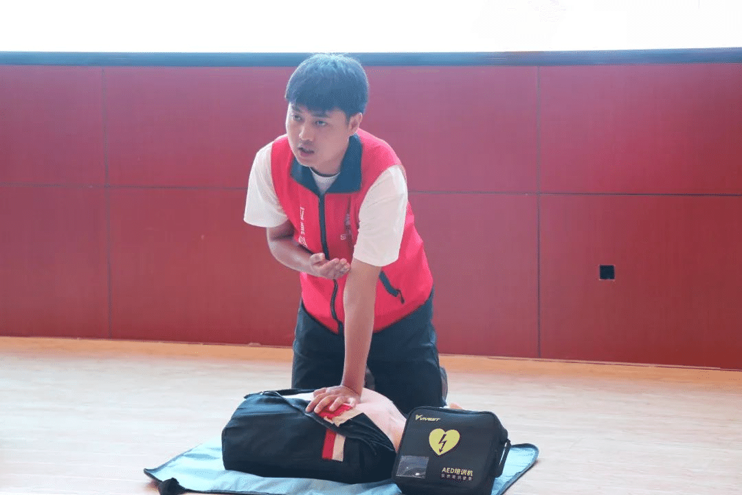 在理论讲解环节,陈浩宇以《关爱生命 救在身边》为主题,围绕心肺复苏术(CPR)、自动体外除颤仪(AED)的使用方法等核心急救技能,通过深入浅出的讲解、生动形象的案例分析,将专业知识转化为通俗易懂的内容。同时,他还进行现场演示,详细拆解每个动作的标准流程、操作要领与关键注意事项,让参训人员对急救技能有了更直观、清晰的认识。