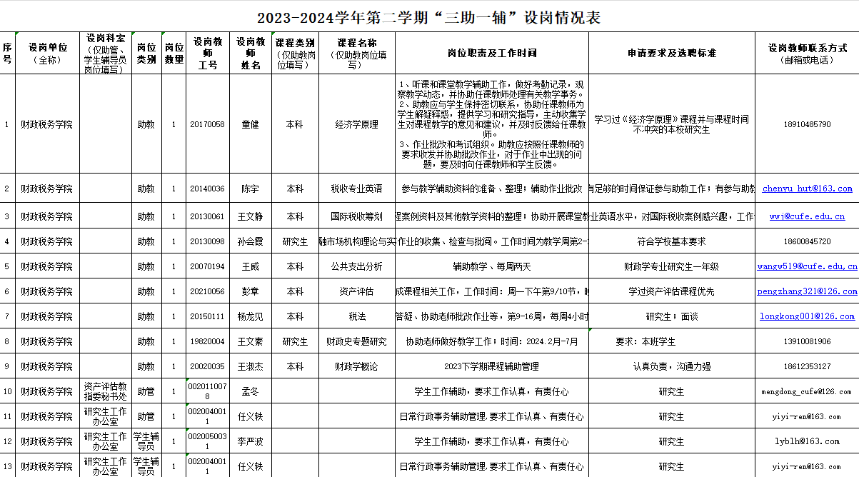 下表是kaiyun开云官方2023-2024学年第二学期“三助一辅”设岗情况,请有意向申报的研究生根据公布的联系方式自行联系设岗教师,设岗老师在3月12日前完成选聘工作。