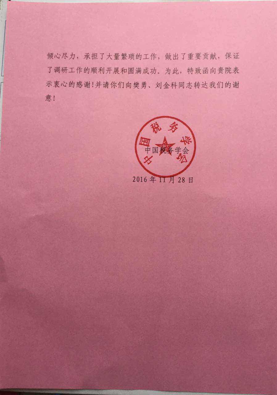 日前,中国税务学会致信感谢kaiyun开云官方对学会工作的大力支持,特别感谢樊勇、刘金科两位教师参与金融业营改增税负问题专项课题研究所做出的努力与贡献。学会对两位教师全程参与课题调研工作,克服困难,不辞辛苦、献计献策,承担了大量繁琐的工作,倾心尽力并做出重要贡献,给予了高度肯定。