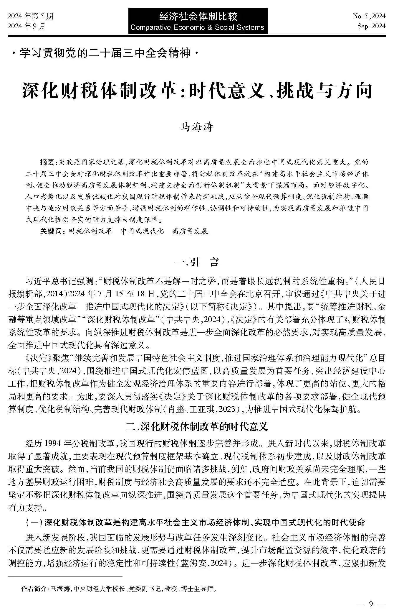 马海涛 || 深化财税体制改革:时代意义、挑战与方向