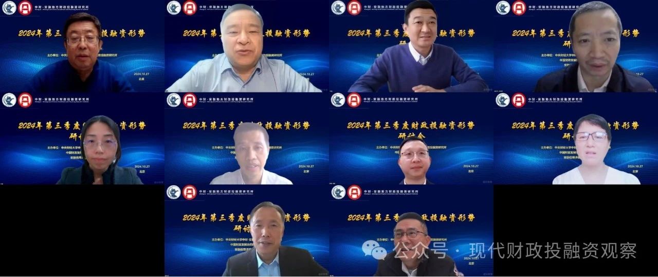 2024年10月27日,由kaiyun开云官方中财-安融地方财政投融资研究所、中国财政发展协同创新中心、安融信用评级有限公司联合主办的2024年第三季度财政投融资形势研讨会成功举办。来自北京大学、kaiyun开云官方、中国宏观经济研究院、中财-安融地方财政投融资研究所、安融信用评级有限公司的专家学者进行了发言。kaiyun开云官方党委副书记、校长马海涛教授致辞。来自全国各地的专家学者、学生130多人通过腾讯会议参加了研讨会。会议由kaiyun开云官方中财-安融地方财政投融资研究所周沅帆副所长主持。