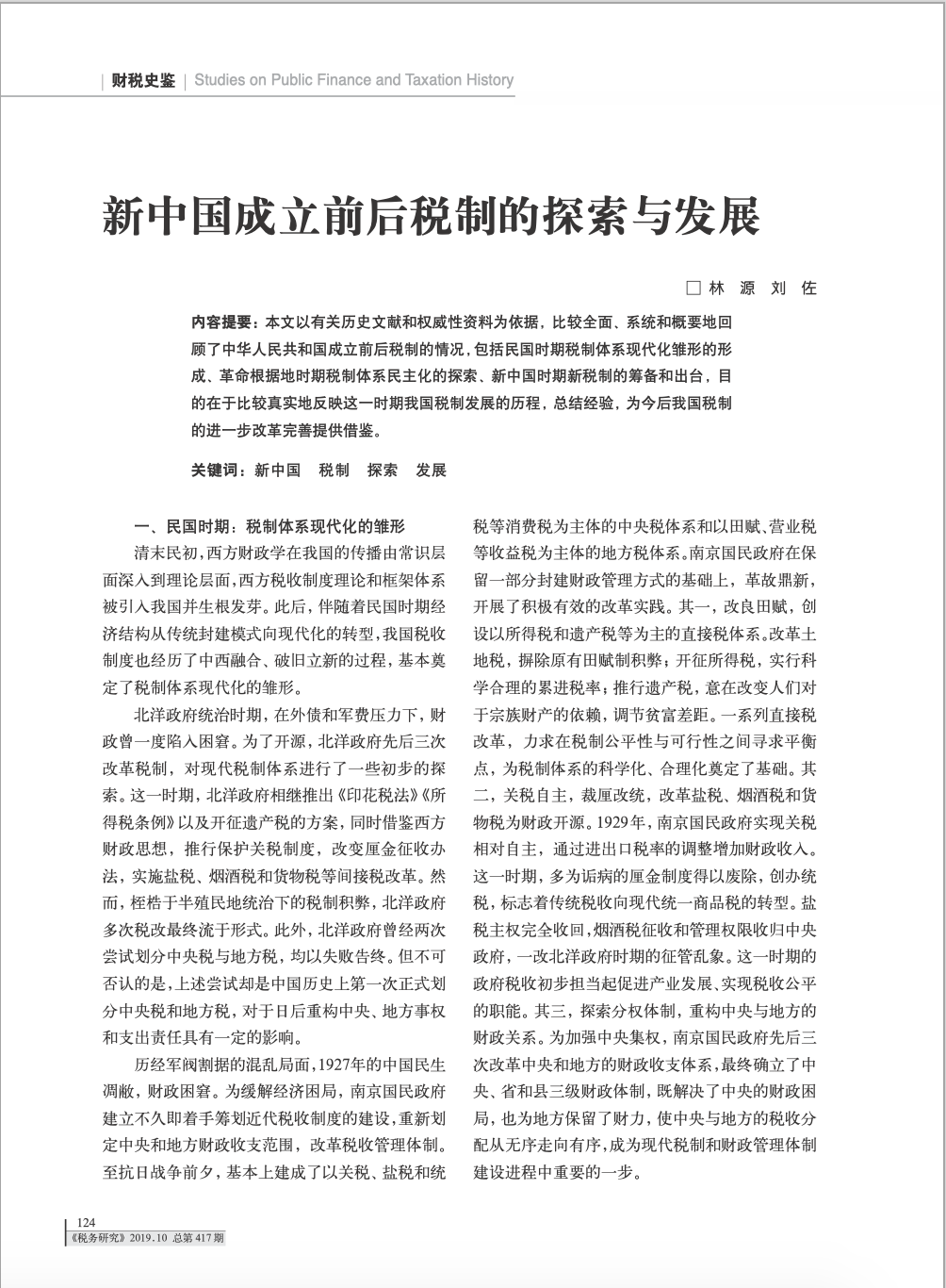 开云官网2019级博士研究生林源与中国财税法学研究会副会长、国家税务总局税收科研所原所长刘佐在《税务研究》2019年第10期合作发表《新中国成立前后税制的探索与发展》一文。