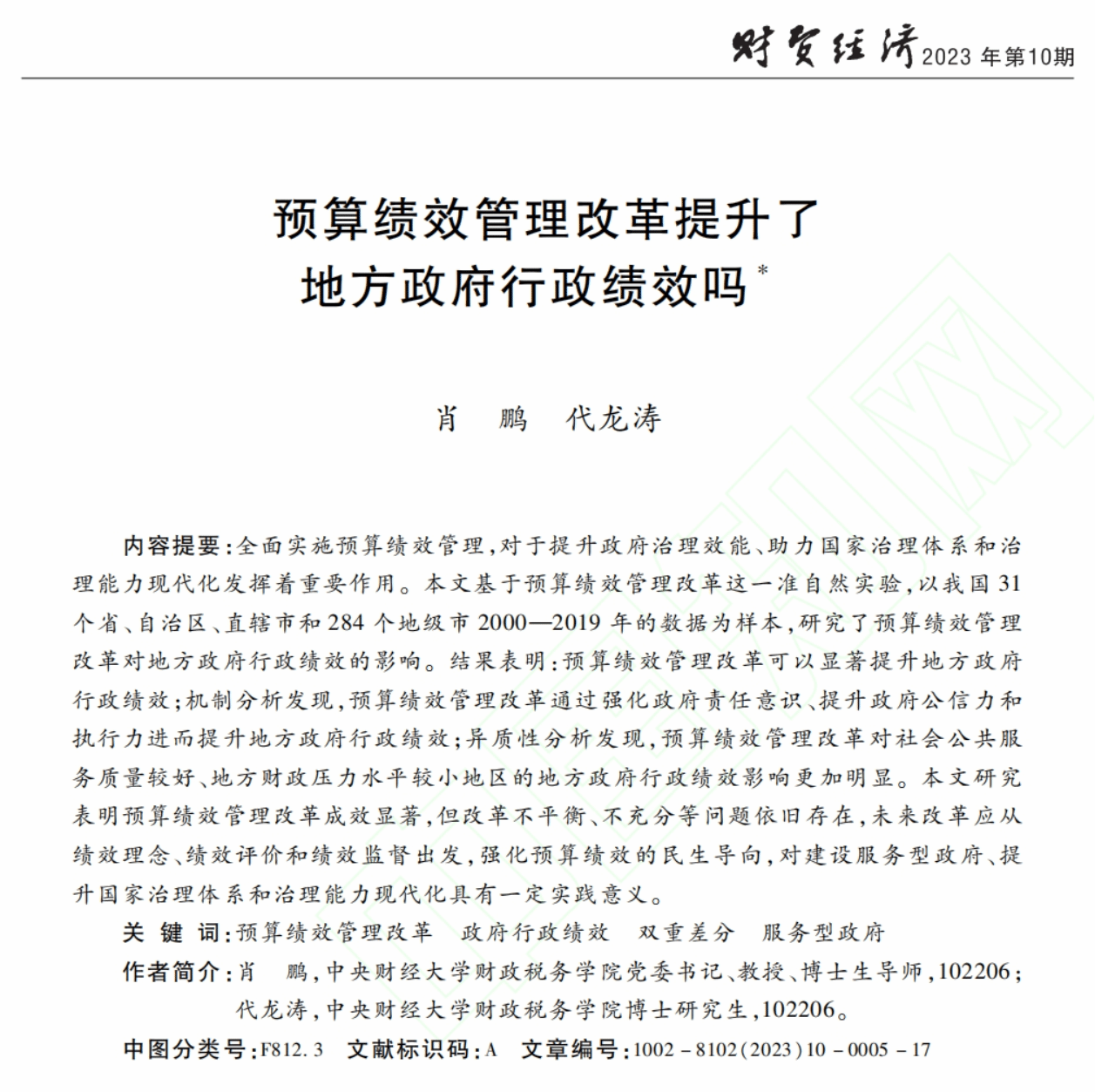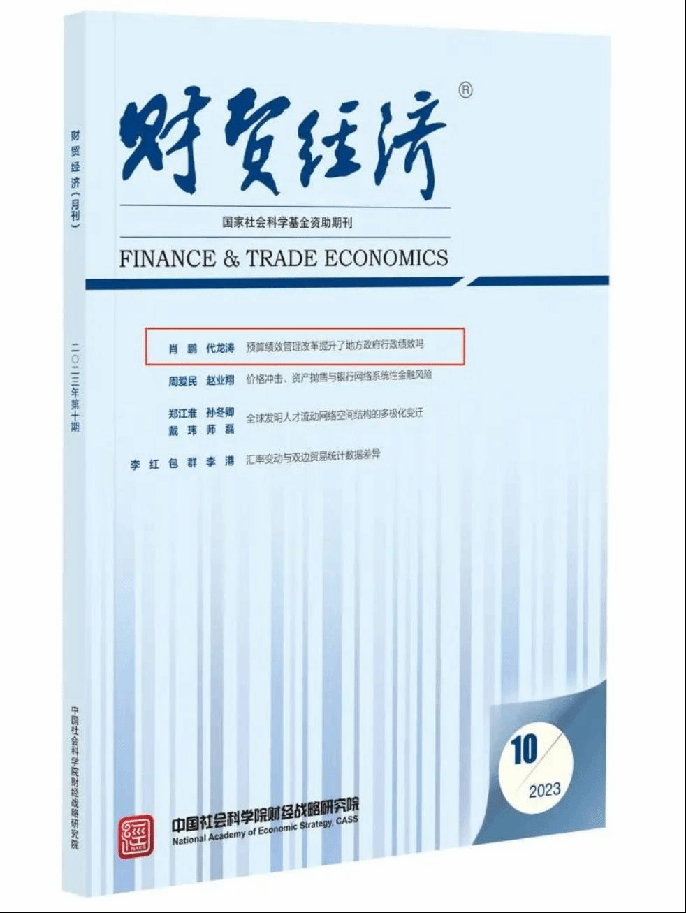 近日,由kaiyun开云官方肖鹏教授和代龙涛博士撰写的论文《预算绩效管理改革提升了地方政府行政绩效吗》在中文A类期刊《财贸经济》2023年第10期作为封面文章刊发。以下为文章主要内容: