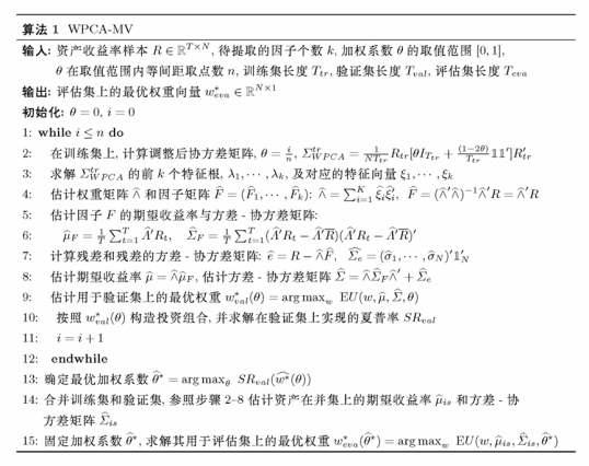 为克服PCA因子在估计收益率一阶矩时的局限性,作者在PCA的目标函数中引入收益率均值加权过程,从而构建了一种可同时估计股票期望收益率和方差-协方差矩阵的加权PCA算法(WPCA);进一步地,作者基于该算法构造的统计因子模型来估计股票期望收益率和方差-协方差矩阵,然后将改进估计量带入MV策略,形成WPCA-MV策略,以期通过提高投资组合优化问题中输入参数的估计精度来改进MV策略的绩效表现。