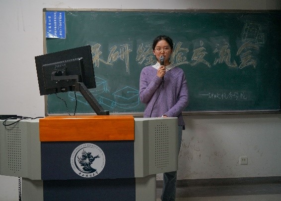 第一位进行分享的是来自财政17-2的程心雨,保研专业是北京大学汇丰商学院金融专业硕士。她向同学们介绍了相关的保研项目信息以及保研的相关流程。程心雨还基于自身经验给学弟学妹们提出了三点建议:一是认识自己,寻找匹配的项目;二是要保持良好的学习状态;三是要对保研项目保有强烈的意愿。