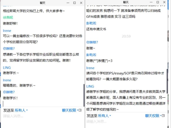 已经归国的张佳瑞、王舒柳同学分别介绍了在华威大学和格拉斯哥大学的求学历程、校园生活和英国的社会人文环境。他们强调,要以自己的兴趣点出发,选择真正适合自己的学习、生活方式,国外生活会更加全面的锻炼自己的表达能力、社交能力和解决问题的能力,善于运用自己的海外经历为求职加分。