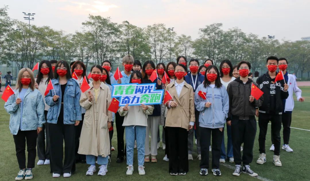 主题教育活动结束后,开云官网学生举着国旗和“青春闪光、奋力奔跑”等祝福标语在校园中合影留念。