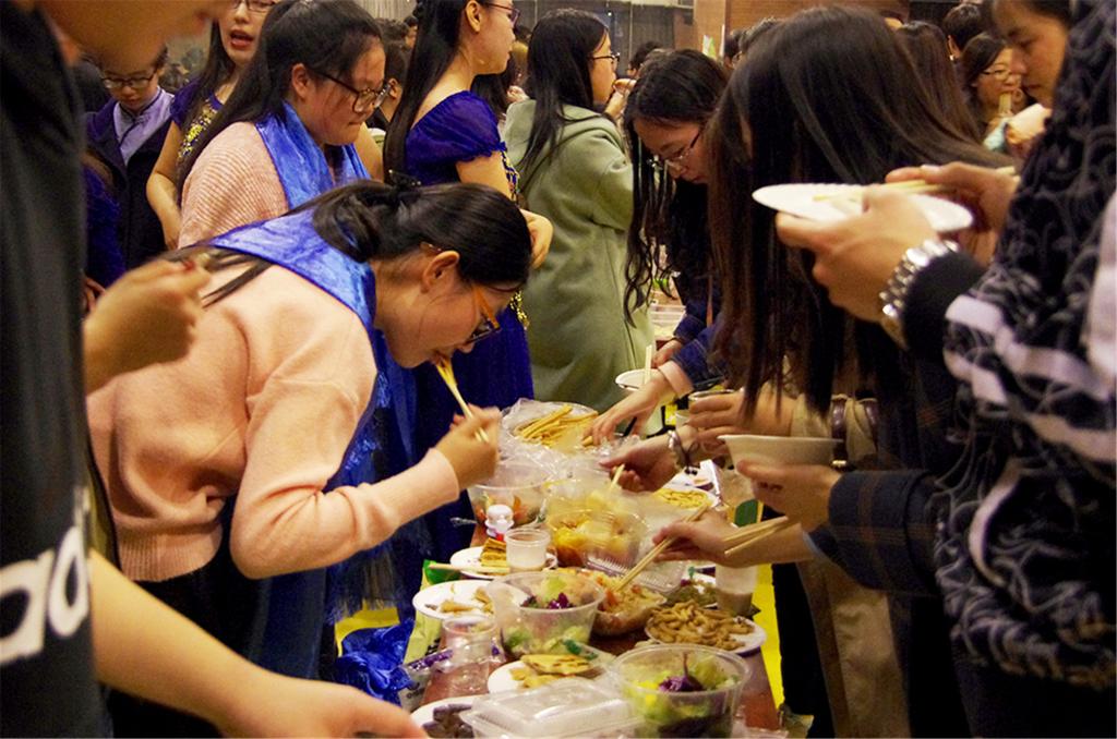 接着,各组同学开始分享美食、进行游戏。每个地区将在本展位前设立一个具有地方特色的小游戏,现场的同学均可参加,集齐五个组的游戏印章即可获得一次答题机会,答对题即可获得奖品。同时,各个摊位前均摆满了美食,热闹非凡,“蜀人贵芹芽脍,杂鸠肉为之”、“秦烹惟羊羹,陇馔有熊腊”“小饼如嚼月,中有酥和饴”。稻香村、天津麻花;酱板鸭、兔头、灯芯糕;新鲜椰子、鳗鱼干……珍馐美味,饕餮美食,应有尽有。每个摊位上的同学们都热情地介绍着家乡的风味,品尝的同学们满足的享用着各地美食,玩游戏的同学们摩拳擦掌,跃跃欲试,现场一片欢歌笑语,热闹非凡。