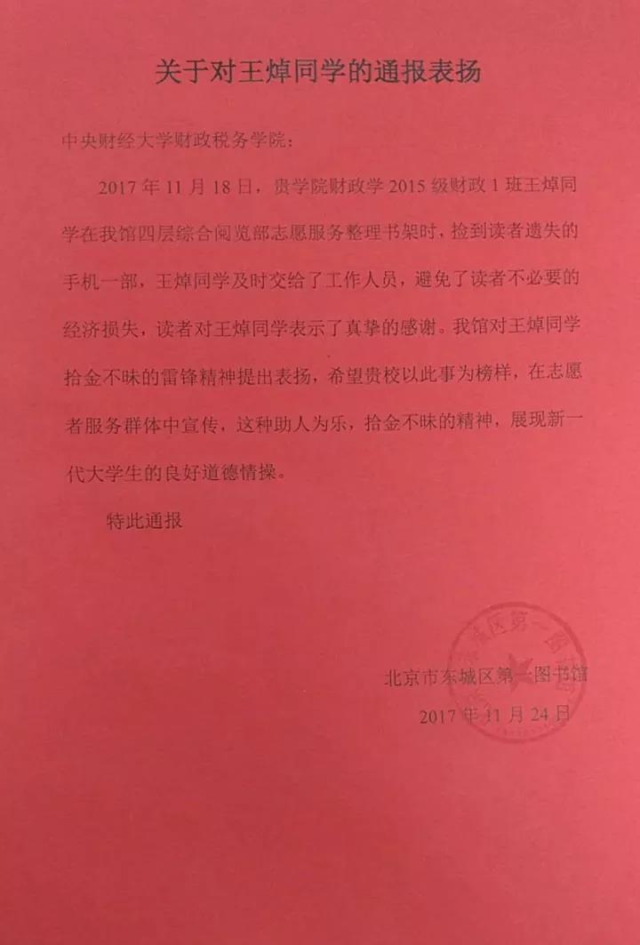 事后,找回手机的读者对王焯同学表达了真挚的感谢,北京市东城区图书馆也对王焯同学拾金不昧的雷锋精神给予了高度赞扬,并给开云官网发来了通报表扬信。