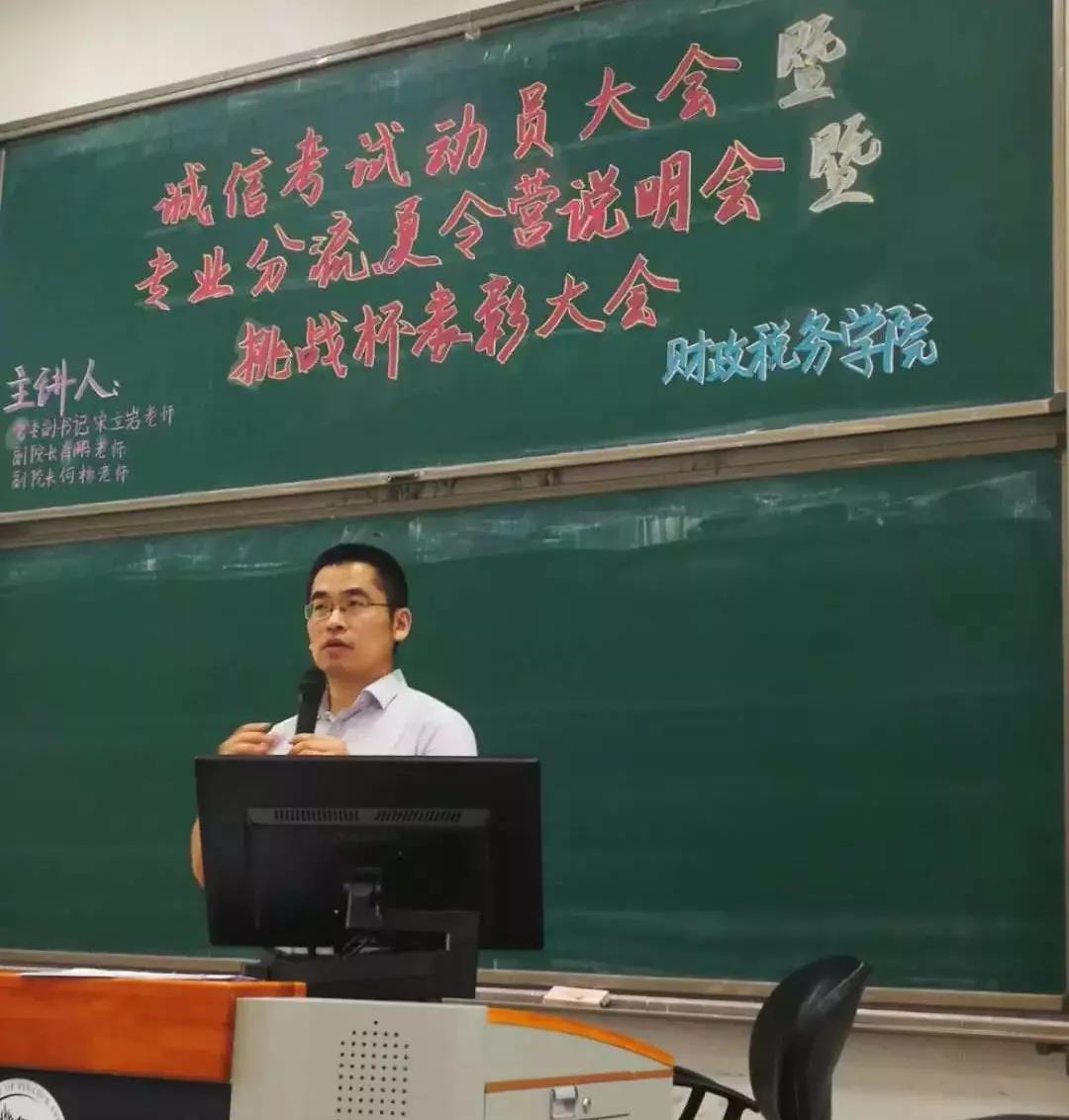 6月13日下午2点,kaiyun开云官方在沙河校区东区主教215教室举行了诚信考试动员大会暨专业分流说明会暨挑战杯表彰大会。本次大会由财政学类17-6班刘逸童同学主持,党委副书记宋立岩老师,副院长肖鹏老师,学生办公室主任、2016级本科生辅导员于来老师,团委副书记、2015级本科生辅导员陈颖老师,2017级本科生辅导员徐燕妮老师参加了本次大会,kaiyun开云官方大一、大二、大三各年级的同学均参与其中。