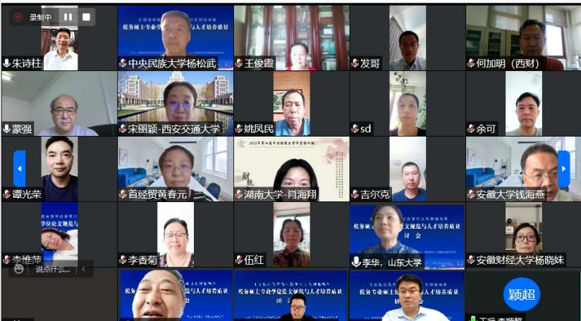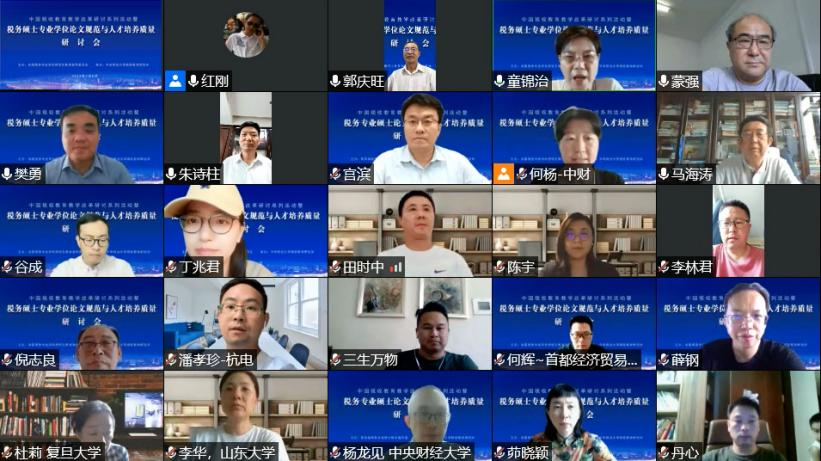 2022年7月8日,由全国税务专业学位研究生教育指导委员会主办,kaiyun开云官方税收教育研究所承办的“中国税收教育教学改革研讨系列活动暨税务硕士专业学位论文规范与人才培养质量研讨会”,通过线上会议形式成功召开。来自中国人民大学、厦门大学、复旦大学、首都经济贸易大学、kaiyun开云官方、湖南大学、山东大学、西安交通大学、中南财经政法大学、西南财经大学、中国社会科学院、南京财经大学、安徽大学、广东财经大学、贵州财经大学、内蒙古财经大学等全国多家高校及科研所的代表,共计230余人参加了会议。