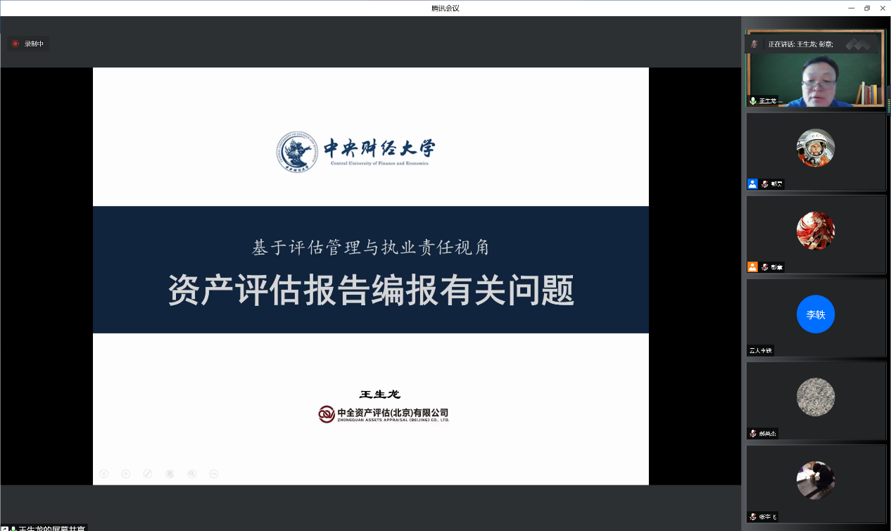 中全资产评估(北京)有限公司董事长王生龙先生为同学们讲授了资产评估报告编制的有关问题,从评估报告的历史,到准则规范、格式和出具等方面,都为同学们进行了深入的分析和讲解。同时,王生龙先生也结合国内外视角,对评估报告在国内外的规范和责任进行了深入的分析。