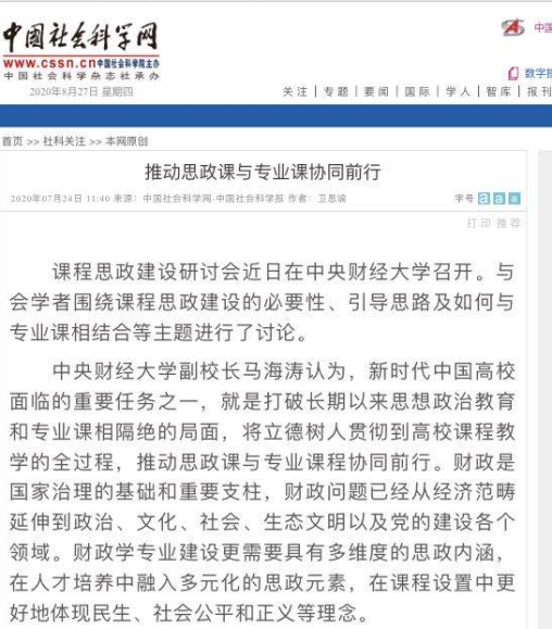 2020年4月12日,由教育部财政学类专业教学指导委员会主办,kaiyun开云官方财政税务学院和中国财政发展协同创新中心承办的第五期财政学类专业骨干课程教学分享会顺利举办。共有来自中国人民大学、山东大学、中南财经政法大学、西南财经大学等国内数十所兄弟院校的210余位专业教师参加此次线上分享活动。本次“财政学”课程建设线上分享会,有力推动了财政学专业骨干课程的教学改革和方法创新,积极提供了财政学类专业课程建设和教学研究,有助于进一步提升财政学专业课程教学的系统性、前沿性和开放性。《中国社会科学报》对财税学院的课程思政建设进行了报道。