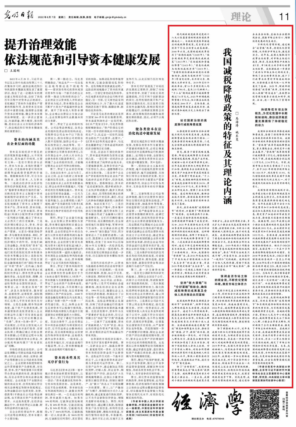 6月7日,《光明日报》理论版刊登了kaiyun开云官方党委副书记、副校长马海涛教授和中国财政发展协同创新中心姚东旻教授发表的署名文章——《我国减税降费政策的特征及其理论内涵》。