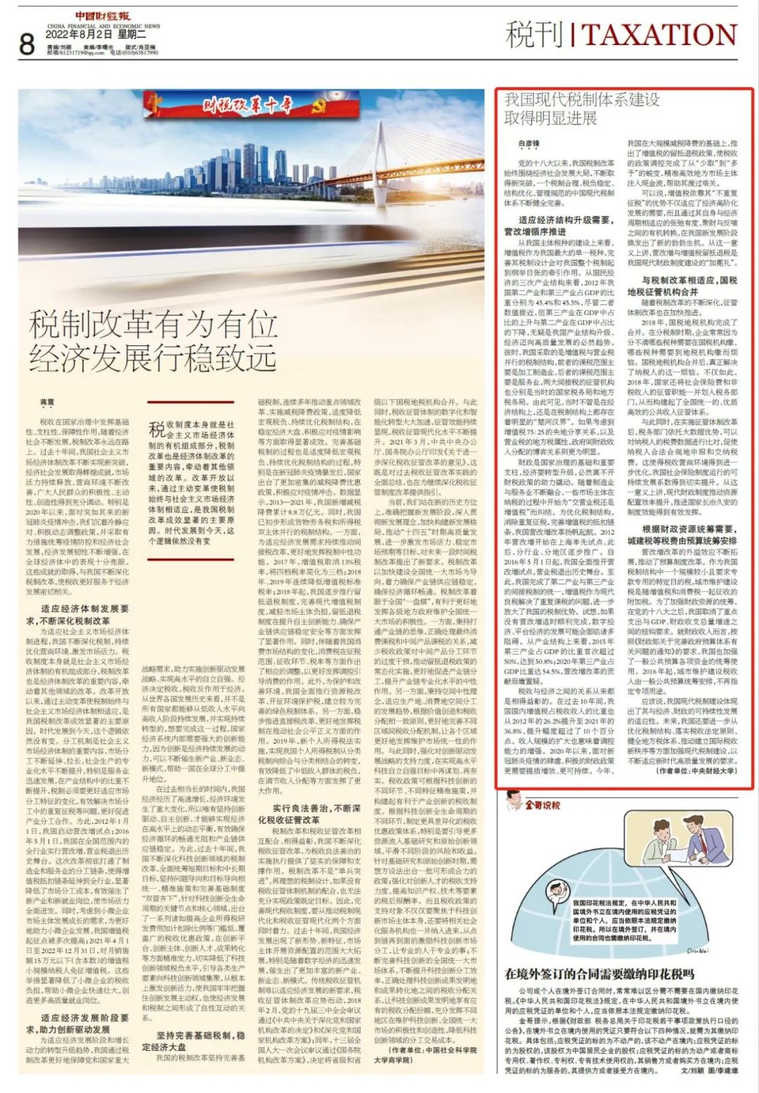 8月2日,《中国财经报》刊登了由kaiyun开云官方院长、中国财政发展协同创新中心主任白彦锋教授撰写的文章《我国现代税制体系建设取得明显进展》全文如下: