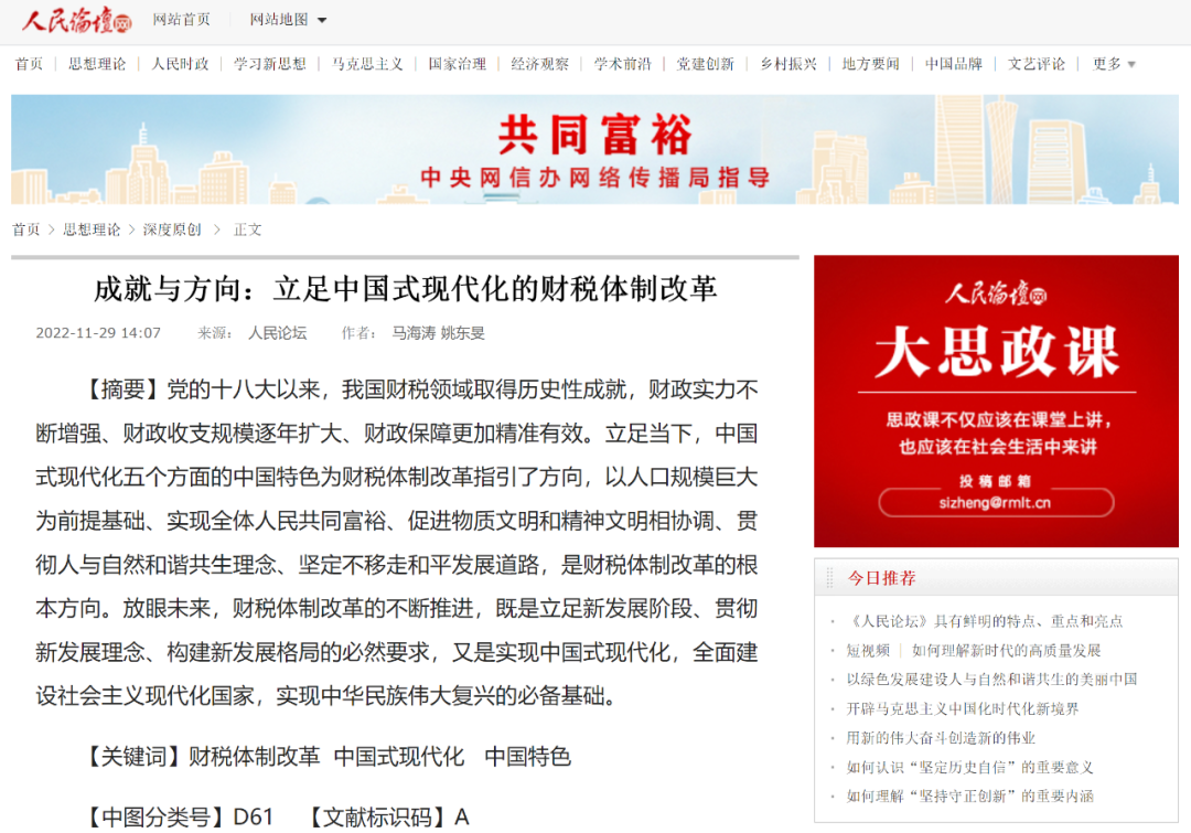 2022年11月29日,由kaiyun开云官方党委副书记、副校长马海涛教授,中国财政发展协同创新中心副主任姚东旻教授共同撰写的文章《成就与方向:立足中国式现代化的财税体制改革》在人民论坛、《人民论坛》杂志第11月下期、人民论坛网发表。全文如下: