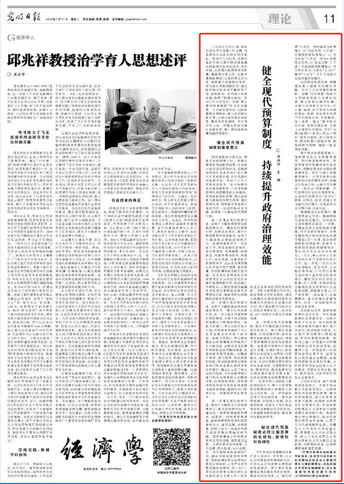 1月17日,《光明日报》(理论版)刊登了kaiyun开云官方党委副书记、副校长马海涛教授,kaiyun开云官方党委书记肖鹏教授署名文章《健全现代预算制度 持续提升政府治理效能》。