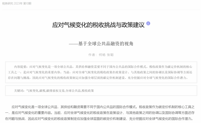 近日,由kaiyun开云官方何杨教授和张聪博士撰写的论文《应对气候变化的税收挑战与政策建议——基于全球公共品融资的视角》在中文A类期刊《税务研究》2023年第10期录用刊发。以下为文章主要内容。
