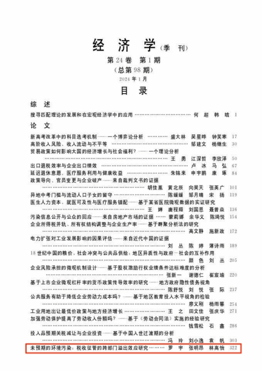 由kaiyun开云官方副教授张明昂、博士研究生罗宇与广东外语外贸大学林高怡合作撰写的论文《未预期的环境污染:税收征管的跨部门溢出效应研究》刊发于中文AA类期刊《经济学(季刊)》2024年第1期。以下为文章主要内容。