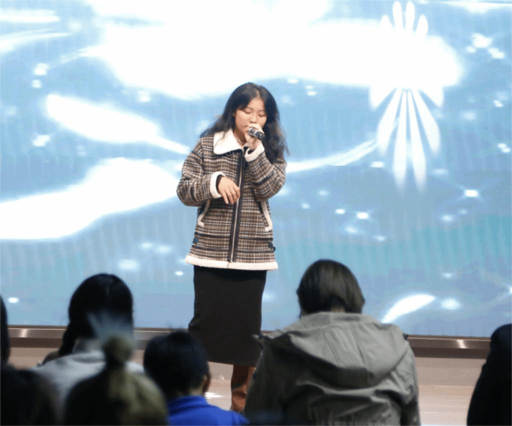 由潘思佳同学演唱,王美宁同学和于好同学伴舞带来歌舞表演《这世界那么多人》。空灵悦耳的歌声与轻盈飘逸的舞蹈让我们沉醉不已。这世界那么多人,我们感恩彼此的相遇。