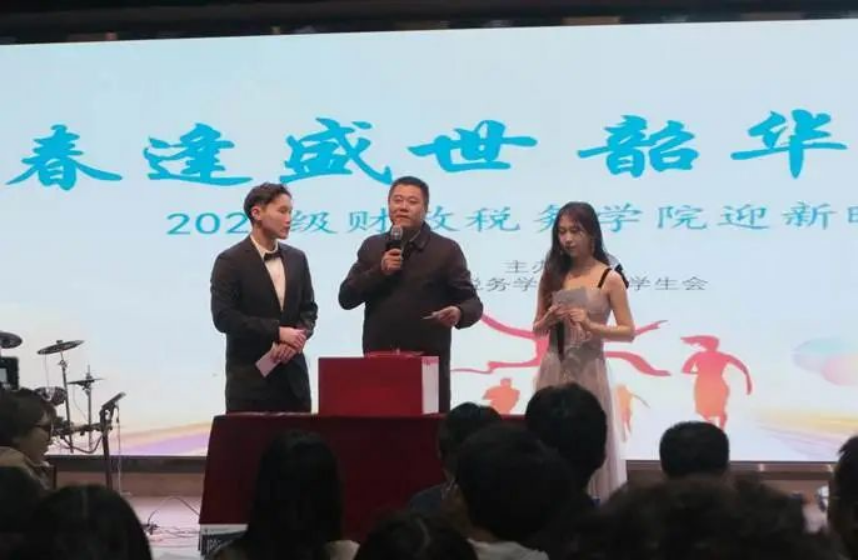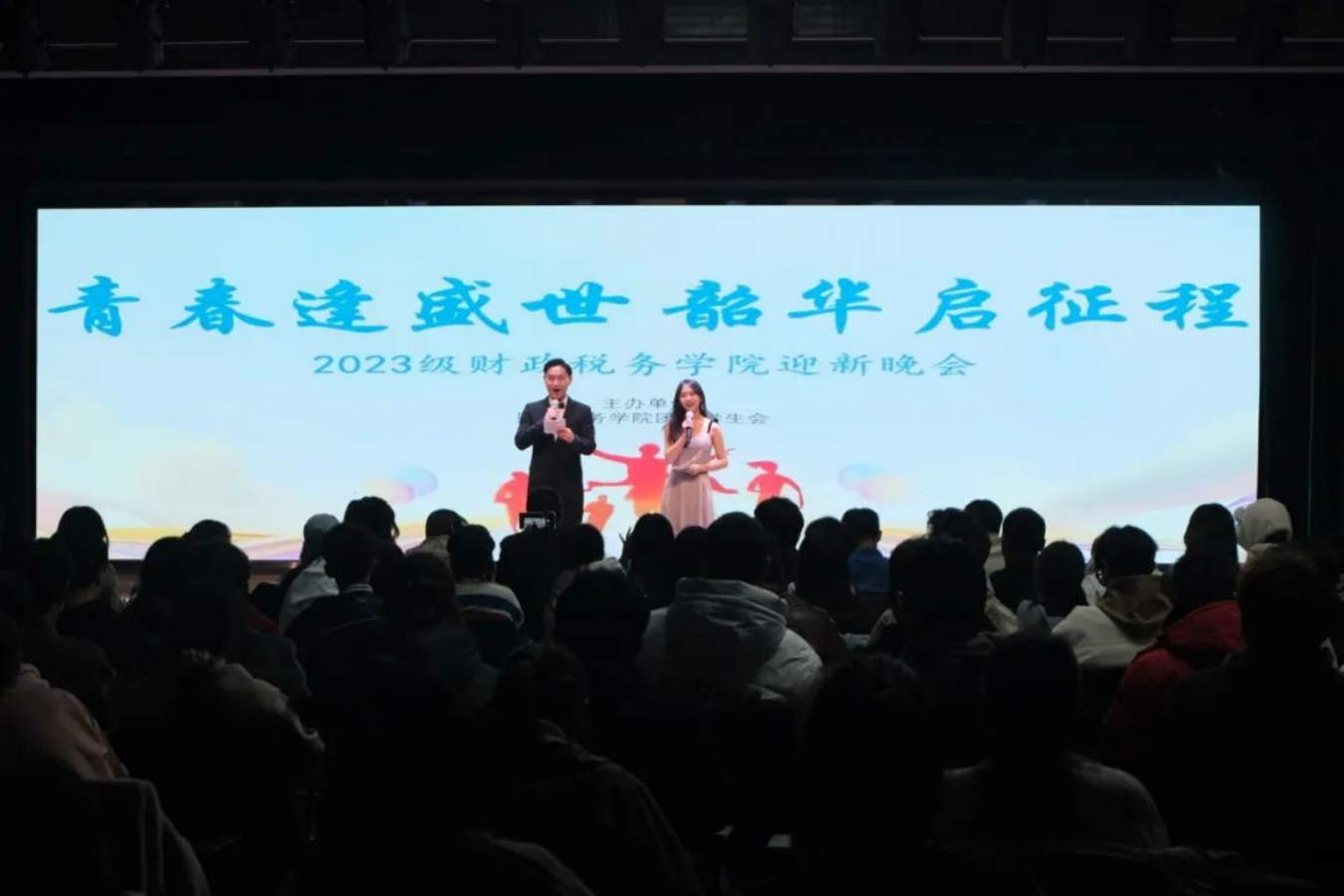 11月8日晚,kaiyun开云官方2023年迎新晚会于大学生活动中心精彩上演。本次晚会由院文体部策划与主办,学生会其他部门协办。学院党委副书记陈士平老师、学院团委书记吕一琪老师、23级辅导员徐燕妮老师、23级班主任邵磊、孙景冉老师以及第八届主席团成员姚军历、尹一凡、徐馨悦、张欣阳,与200余名同学一起观看了本次演出。晚会分为“灼灼华年,遇见财税”“孜孜求索,启航财税”和“熠熠生辉,逐梦财税”三个篇章;特别添加“家长寄语播放”和“中场抽奖”环节。